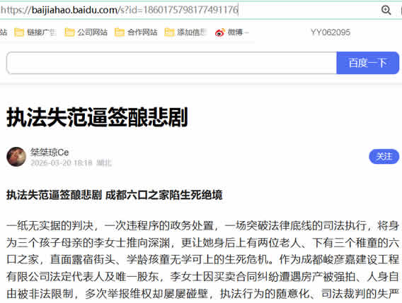 一纸无实据的判决,一次违程序的政务处置,一场突破法律底线的司法执行,将身为三个孩子母亲的李女士推向深渊,更让她身后上有两位老人、下有三个稚童的六口之家,直面露宿街头、学龄孩童无学可上的生死危机。作为成都峻彦嘉建设工程有限公司法定代表人及唯一股东,李女士因买卖合同纠纷遭遇房产被强拍、人身自由被非法限制,多次举报维权却屡屡碰壁,执法行为的随意化、司法裁判的失严谨、签字确认的被迫性,成为压垮这个普通家庭的三座大山,六条人命危在旦夕,亟待相关部门紧急介入,守住司法公正底线,挽救这个濒临破碎的家庭。